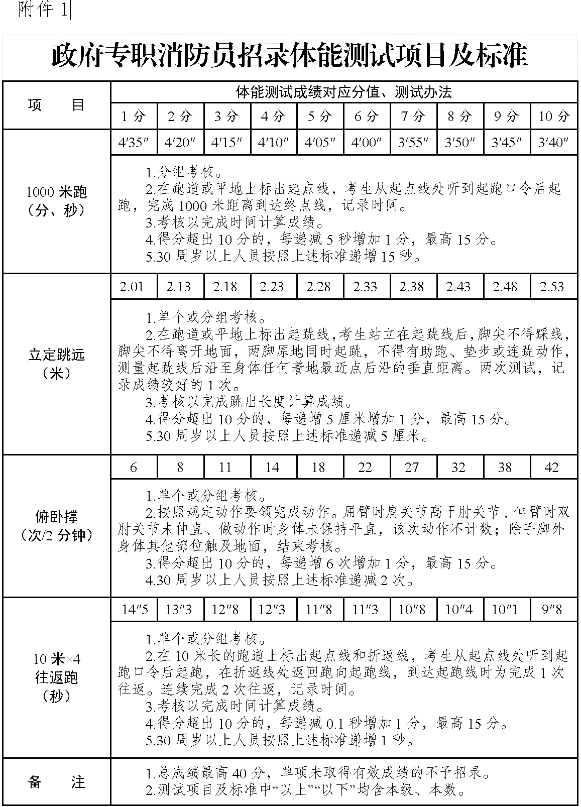 (四)體能測試。按照《政府專職消防員招錄體能測試項(xiàng)目及標(biāo)準(zhǔn)》(附件1)執(zhí)行。體能測試實(shí)行量化評(píng)分,單項(xiàng)有效成績?yōu)?分~15分(未取得有效成績的不予招錄),總成績最高40分。